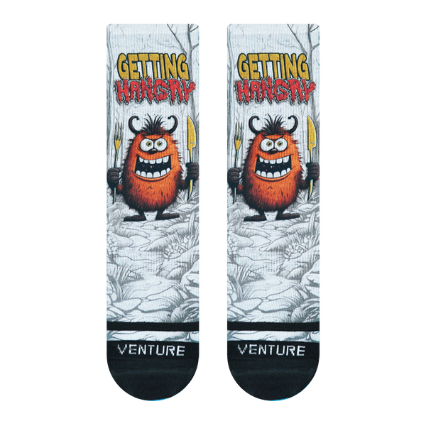 Say hello to our "Getting Hangry" socks, featuring a hungry little monster that brings a playful twist to your look. Slip into these socks and let the monster's charm speak for itself, adding a touch of fun to your style, Venture style