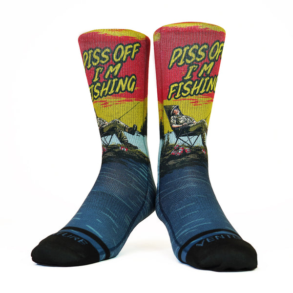 Cast a quirky statement with our 'Piss off I'm fishing' socks, capturing the essence of dedicated anglers. Featuring a snoozing fisherman surrounded by empty beer cans, these socks perfectly embody the art of relaxation on the water.