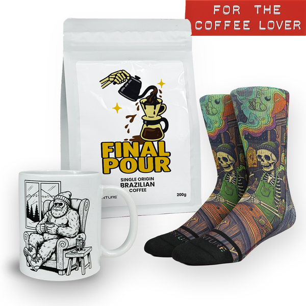 This gift set packs everything a caffeine fiend could ask for - our laid-back Yeti mug, a pair of Barista socks straight from the Deathly Delights series, and a bag of Final Pour single-origin Brazilian coffee to keep the grind alive.