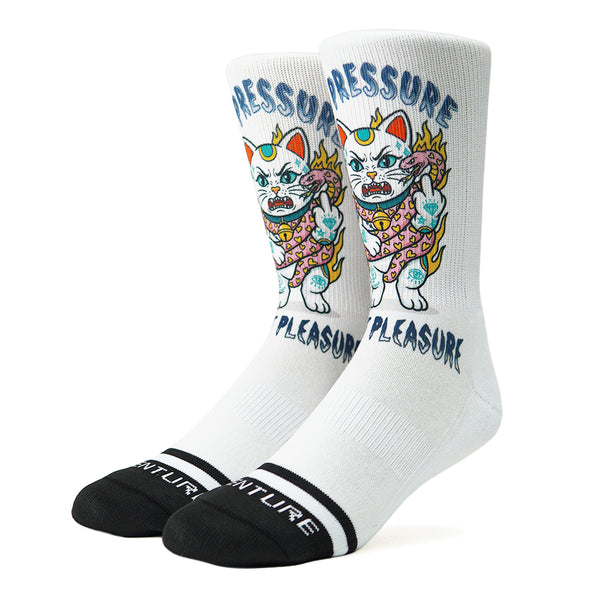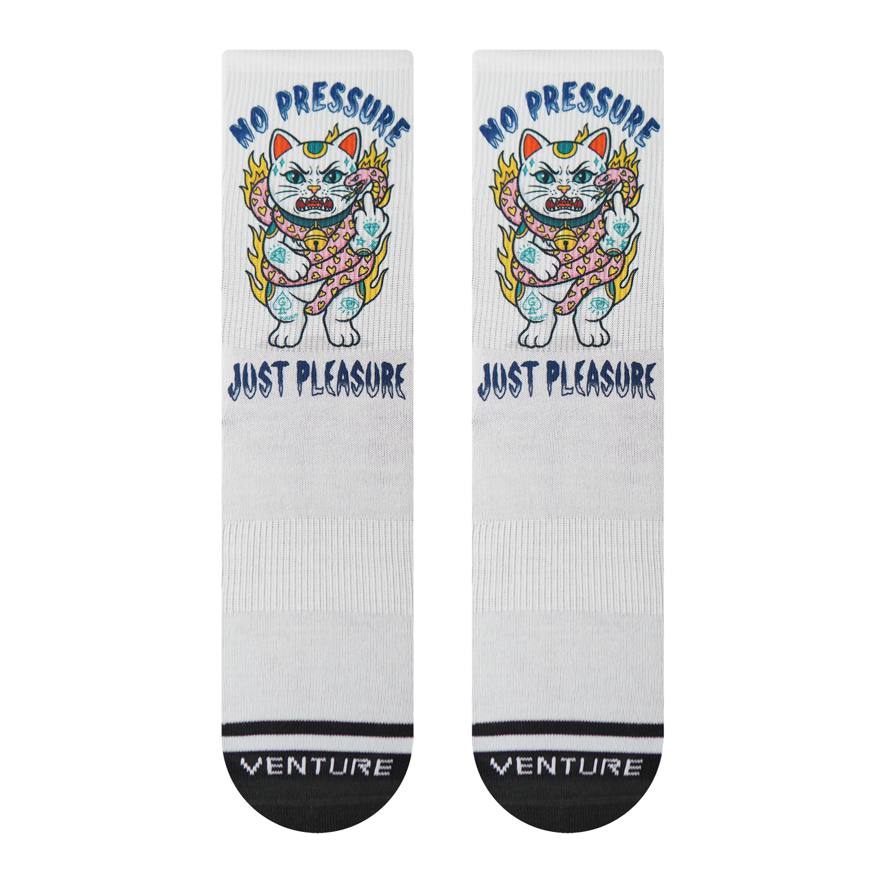 NO PRESSURE throws Angry Cat straight into the chaos. A snake wraps tight, the tension builds, but the attitude doesn’t change. The full scene explodes across the sock in a bold print.