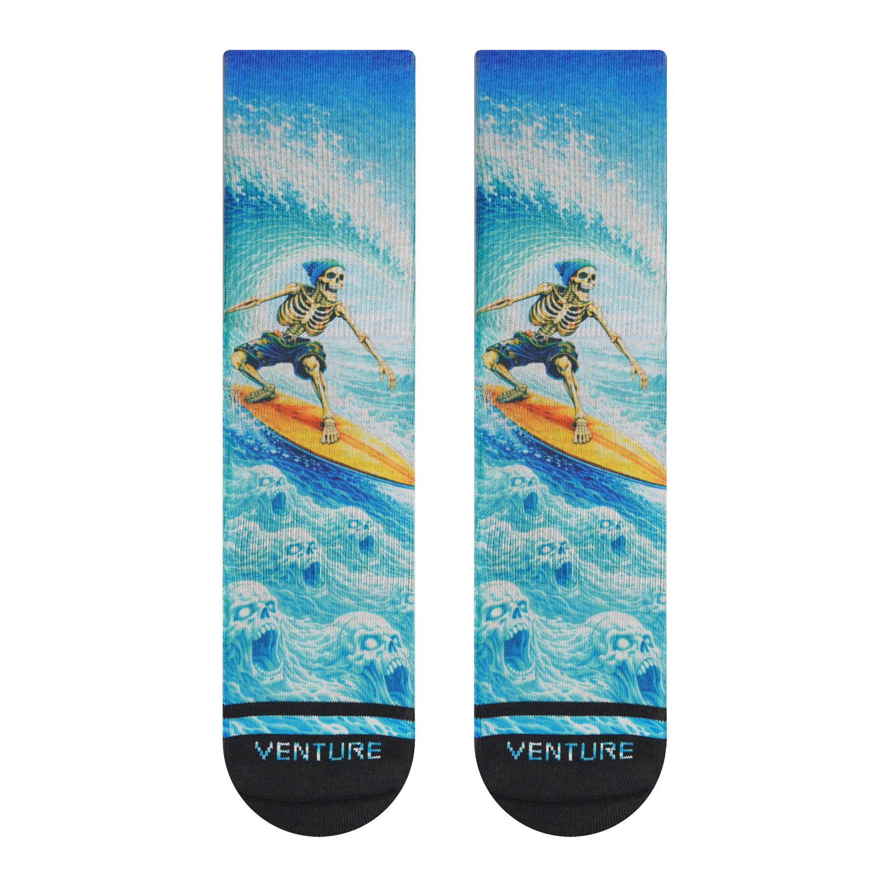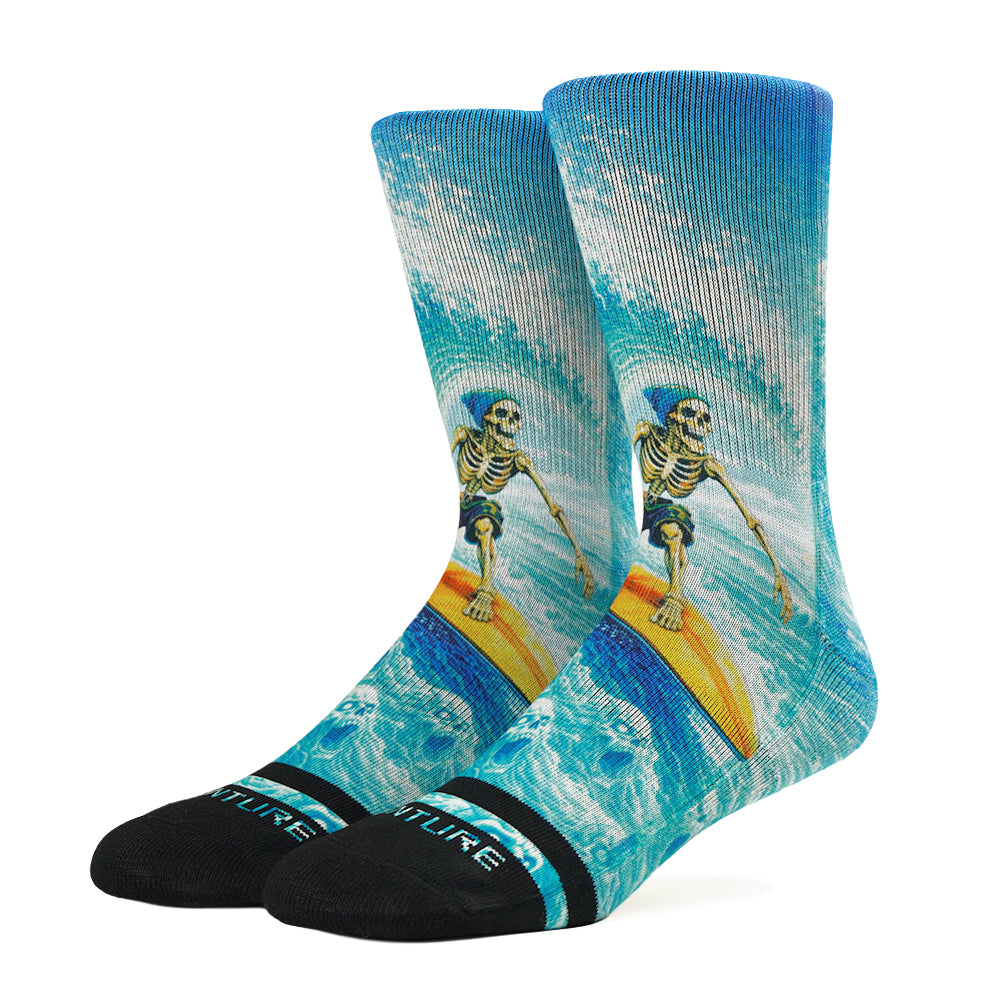 WIPEOUT features a skeleton surfer riding a towering wave of souls. All motion, all chaos, captured in a bold, full-coverage print that wraps the sock from cuff to toe.